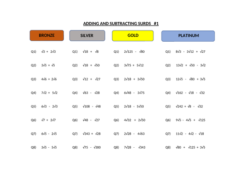 A worksheet where you have a mixture of adding and subtracting surds. These worksheets are pdf files. The questions are in table format.